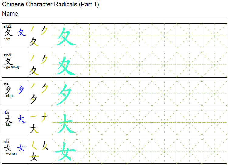 lists all the radicals for simplified Chinese characters. There are 214 radicals in the original Kangxi radical list, but a few of them are no longer used in simplified Chinese. The list of Chinese radicals is a rough equivalent of a Chinese alphabet. They are used to index the characters for Chinese dictionaries. They are also the building blocks of Chinese characters and often reflect some common semantics or phonetic characteristics. Knowing common radicals can help you learn new Chinese characters.