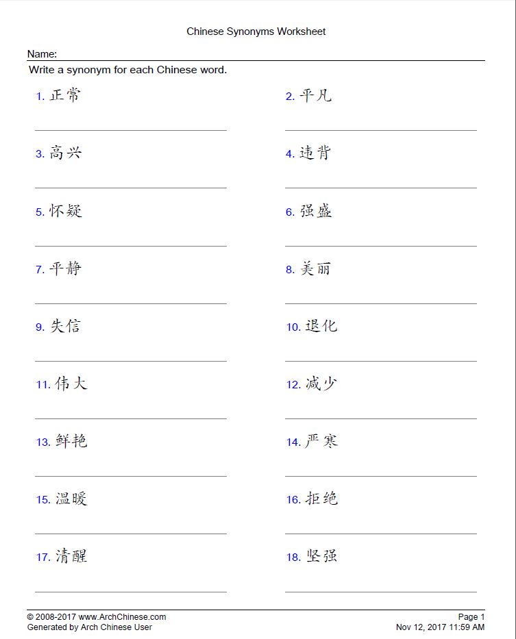 Learning synonyms (words that have similar meanings) and antonyms (words that have opposite meanings) are a great way for students to expand their vocabulary and enhance reading comprehension. This tool allows Chinese teachers to quickly create worksheets for teaching synonyms and antonyms for a variety of grade levels.