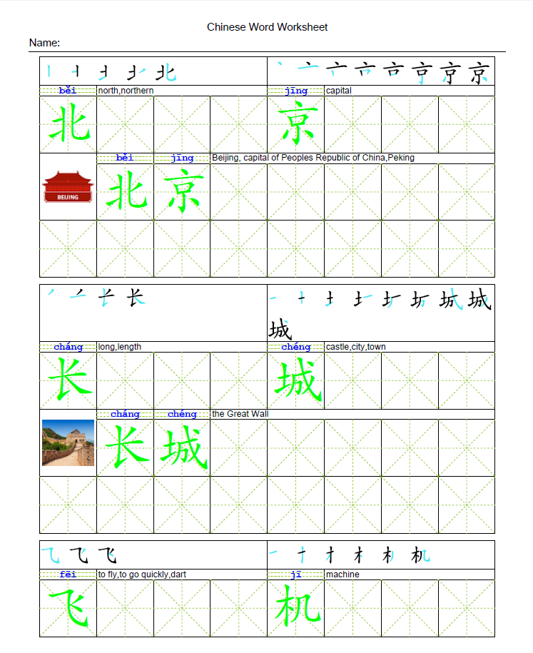 . Chinese students can use the worksheets to practice Chinese words and individual characters at the same time.