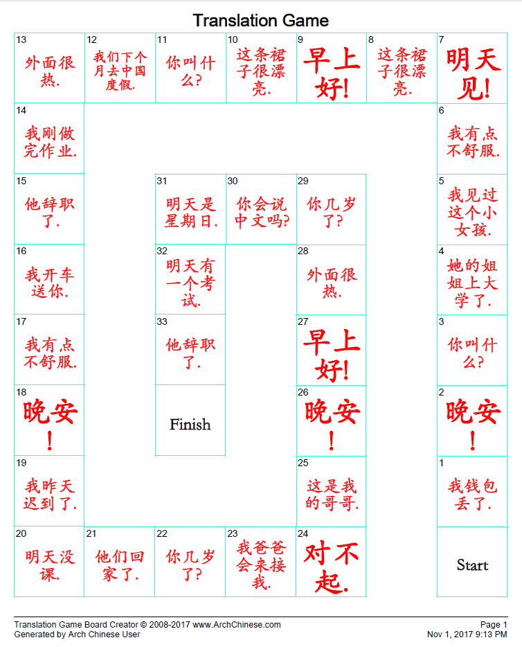 This tool allows Chinese teachers to create fun sentence translation board games for classroom use. The teacher divides the students into groups of three. Each group has two players and one referee. The players roll a die to determine how far to move on the board. The players have to translate the sentence or phrase of the square they've landed on. The referee will then tell the players if their translation is correct by checking the answer sheet. If the translation is correct, the player will have another turn to play. If the translation is incorrect, the referee reads the correct translation to the player. The player must memorize the translation and read it aloud when it is his/her turn again. The player who lands on the Finish square first is the winner.